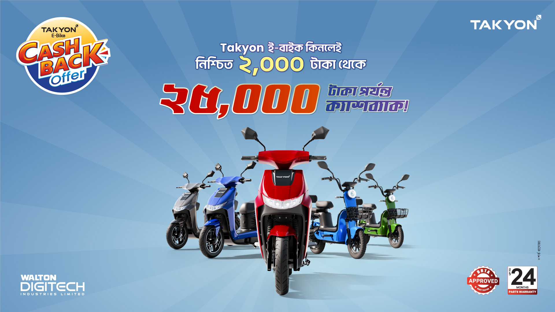Walton Digi-Tech Industries Limited is offering a maximum guaranteed cashback of up to 25,000 BDT on its BRTA approved electric bike series TAKYON. The e-bikes are available in 3 models named TAKYON 1.00 (38Ah), TAKYON 1.00 (26Ah) and TAKYON LEO (23Ah). When purchasing from all Walton Plaza or official dealer outlets across the country along with official website, customers are getting a cashback ranging from a minimum of Tk. 2,500 to a maximum of Tk 25,000 for the TAKYON 1.00 (38Ah) and TAKYON 1.00 (26Ah) models and a minimum of Tk 2,000 to a maximum of Tk 15,000 for the TAKYON LEO (23Ah) model.
